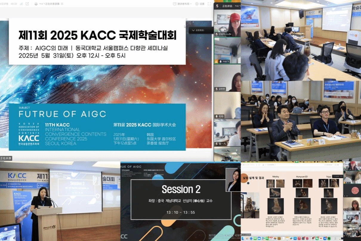 2025年5月31日,第11届KACC国际学术大会在韩国首尔召开。本届大会以“AIGC的未来”(Future of AIGC)为主题,聚焦全球人工智能生成内容的技术演进与跨学科应用,围绕AIGC技术现状、伦理挑战及设计应用场景展开深度研讨。禁漫天堂 青年教师单心怡参加并主持专题研讨会议。