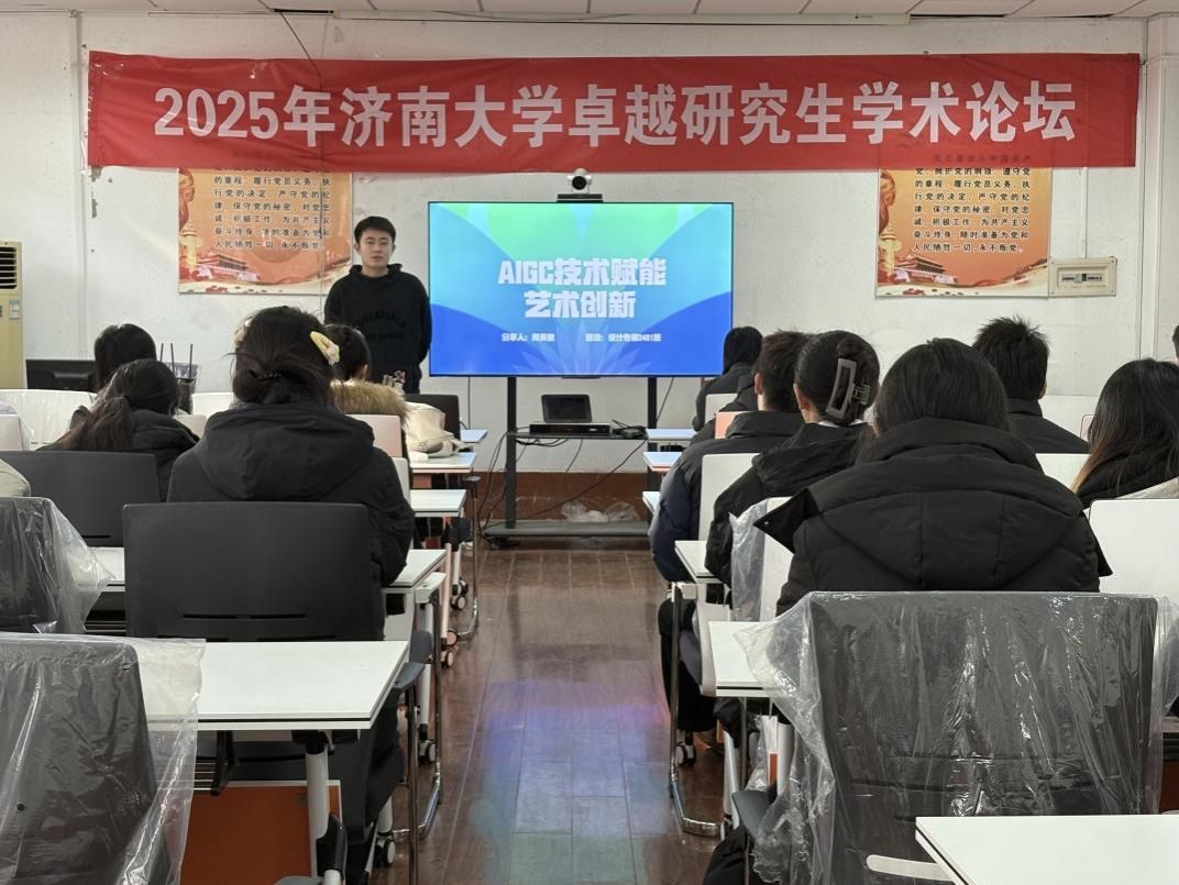 设计专硕2401班的周昊健聚焦科技前沿,分享了《AIGC技术赋能艺术创新》的实践应用。周昊健系统介绍了AIGC技术的发展现状,并通过生动案例演示了AI工具如何为艺术创作与设计思维带来革新性变化。结合自身参赛经验,具体分析了AI技术在优化工作流程、激发创新灵感方面的显著效能。
