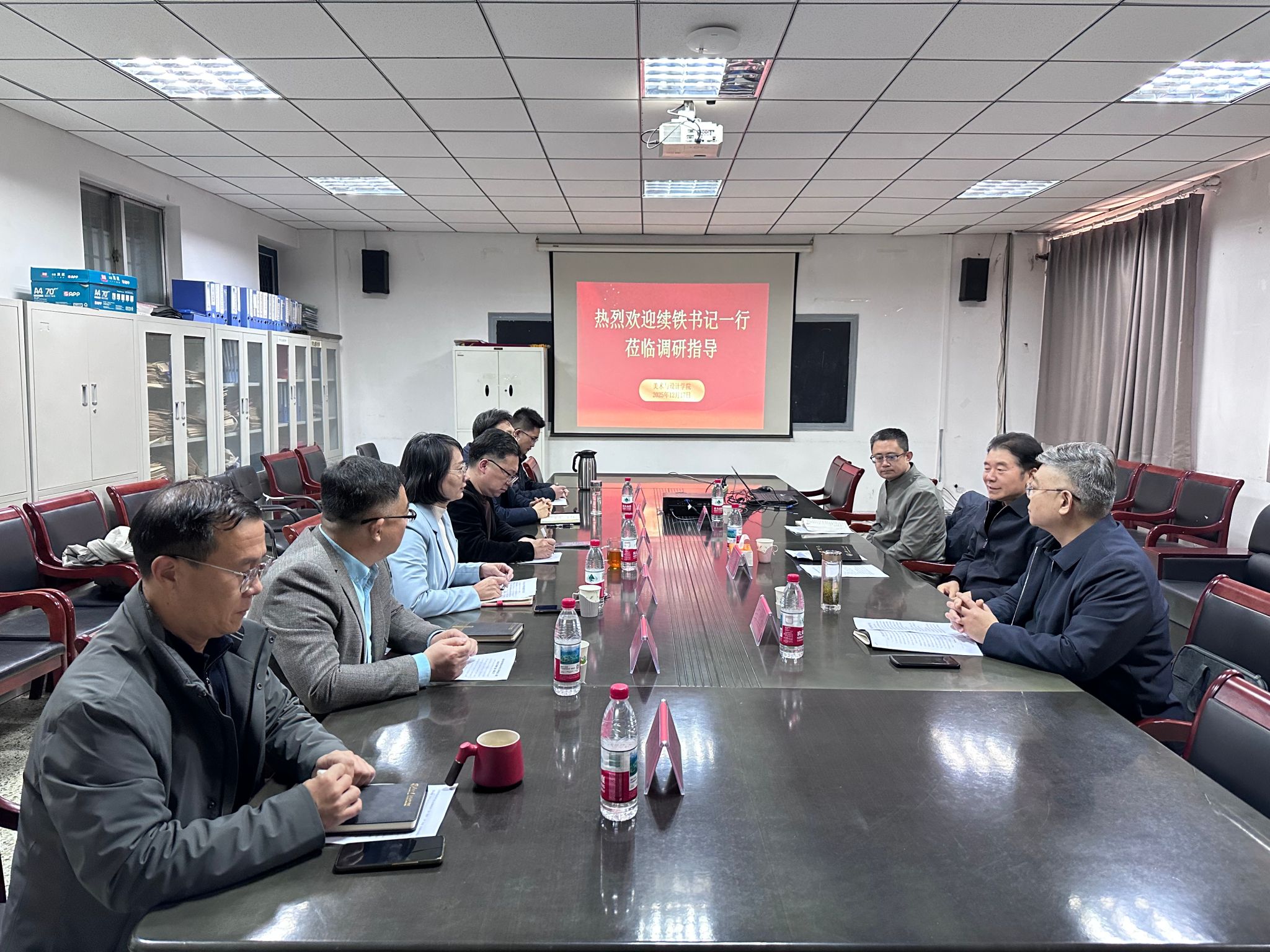 续铁在听取汇报后,对学院工作成效予以充分肯定。指出学院以美育人特色鲜明、班子凝聚力强,党建与业务融合机制创新有力。为进一步发展,提出三点要求:一要将党的创新理论深度融入艺术创作,打造具有感染力的大思政课体系;二要强化党建引领,建强支部堡垒,结合廉洁教育与艺格养成筑牢思想根基;三要围绕“十五五”规划,以国家艺术类重大项目为突破,凝聚合力破解发展难题,打造有全国影响力的美育品牌。
