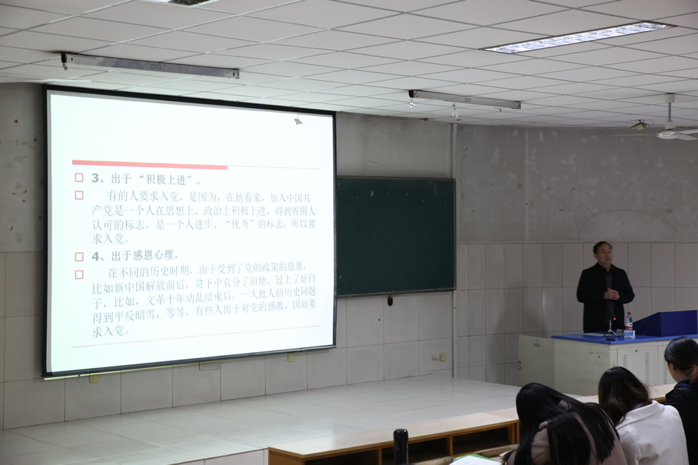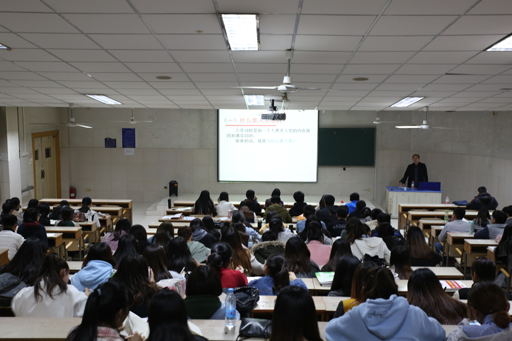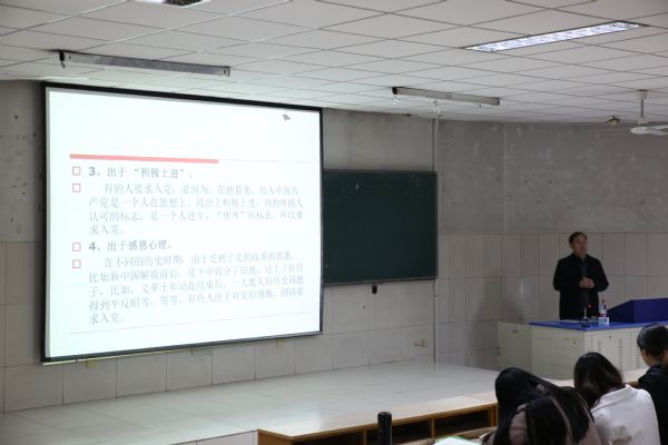 党委副书记刘军老师主讲。首先刘书记由大学生的入党动机讲起,由浅入深。用李大钊、夏明翰、雷锋等共产主义革命烈士的鲜活例子来要我们当代大学生要端正入党动机。从而杜绝有功利型、虚荣型等不正确入党动机的观念。随后刘书记系统地讲解党的指导思想和中国特色理论体系。最后,要求禁漫天堂