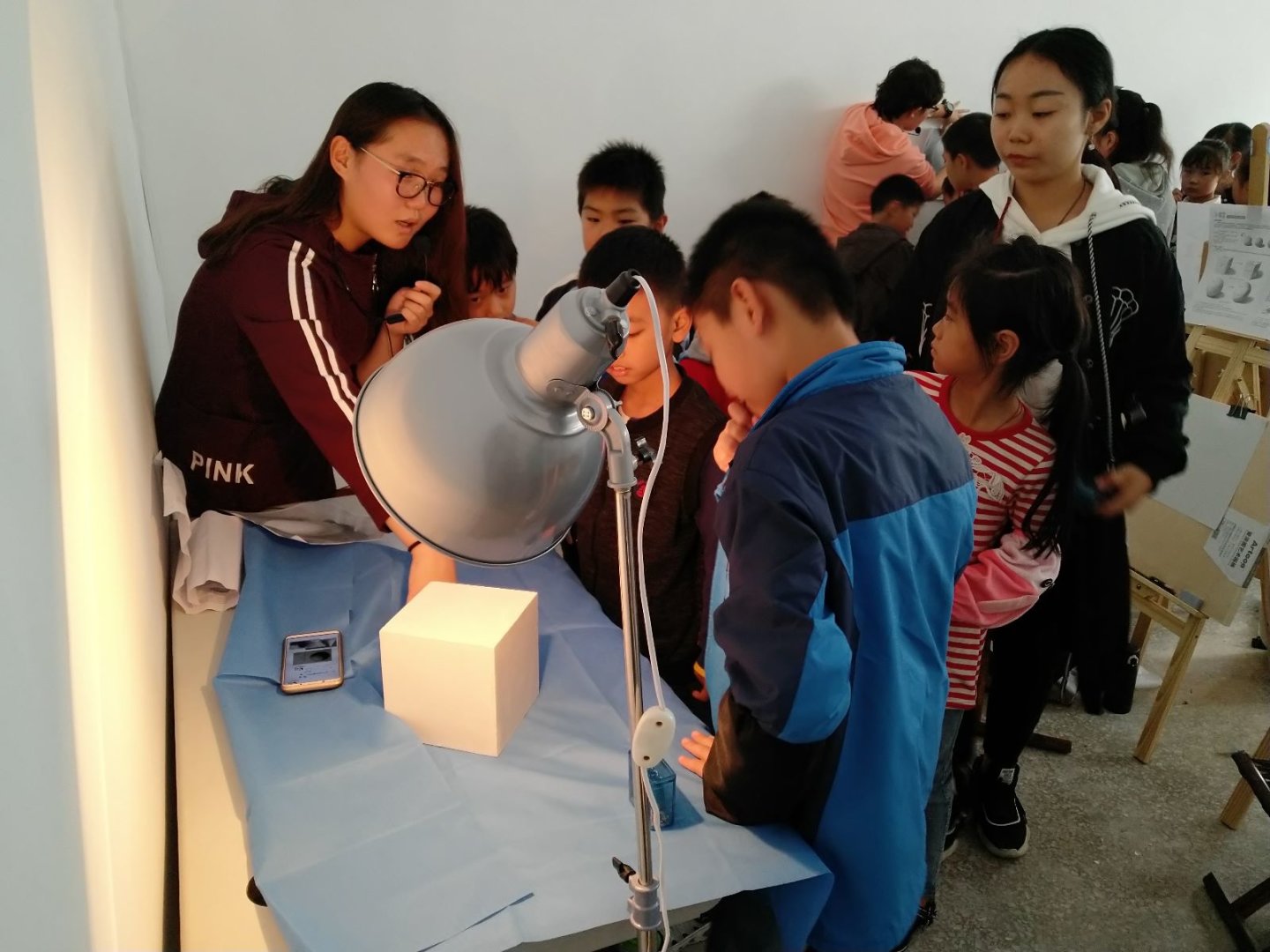 志愿者们2点准时到达临湖社区,面对志愿者的再次到来,孩子们都表现的非常开心。在进行简单的分工后,志愿者们便投入到了工作当中。活动开始,志愿者们在黑板上为孩子们进行了几何体组合示范与步骤讲解,在讲解后,按步骤带领孩子们绘出素描几何组合画,并针对孩子们的画进行点评和修改。在此期间,孩子们积极配合,并对志愿者们指出的错误进行修改。在学习之余,志愿者们还和孩子们分享身边的趣事,教里充满了孩子们和志愿者的欢声笑语。伴随着下课铃声的响起,志愿活动接近尾声。活动最后,志愿者们与孩子们合影留恋,本次支教志愿服务活动圆满结。