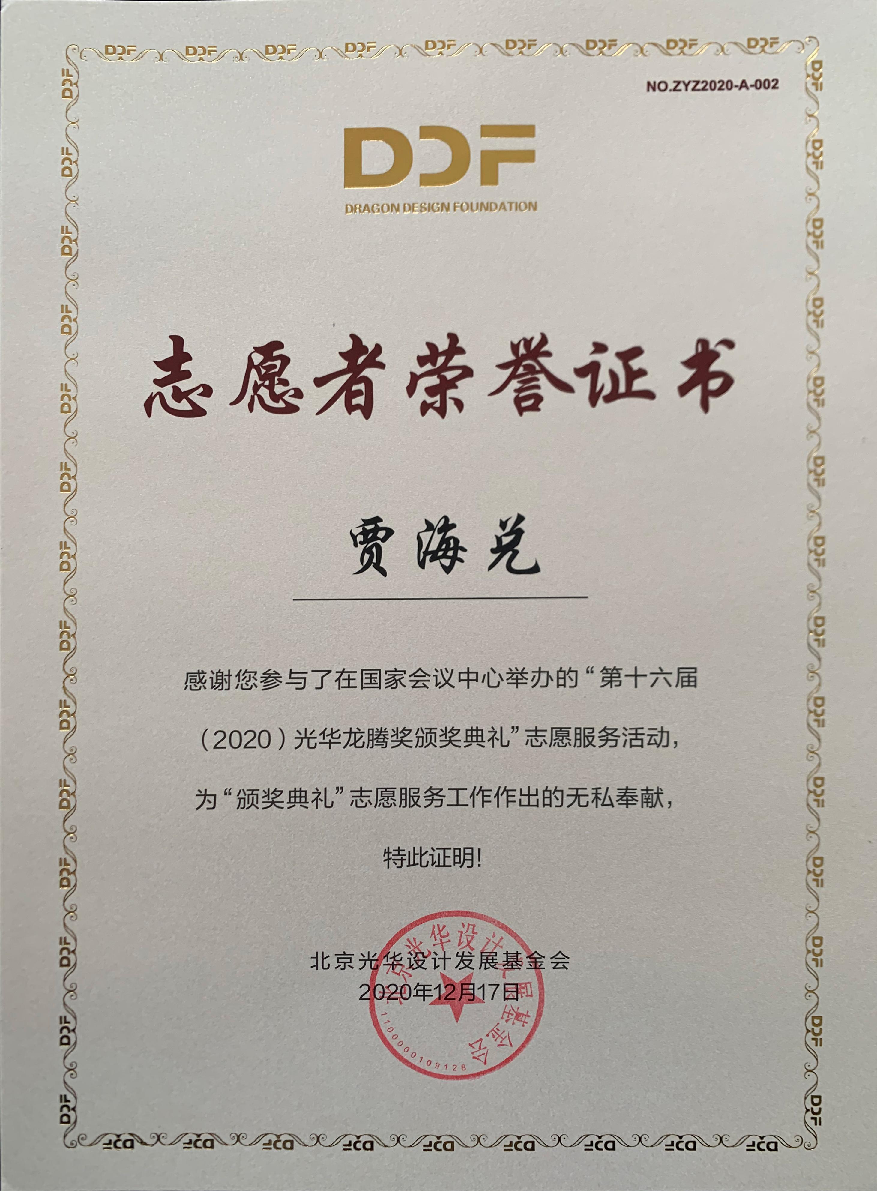 志愿服务队”在杨海波老师指导下,2019级研究生张楠、贾海兑,2020级研究生潘晓钰、唐畋畋、王孝同等同学累计进行了100余小时的志愿服务,服务内容包括图文设计、新闻撰写、网站维护等专业服务,设计方案得到与会专家的高度认可,为第十六届光华龙腾奖颁奖典礼举行做出了突出贡献。