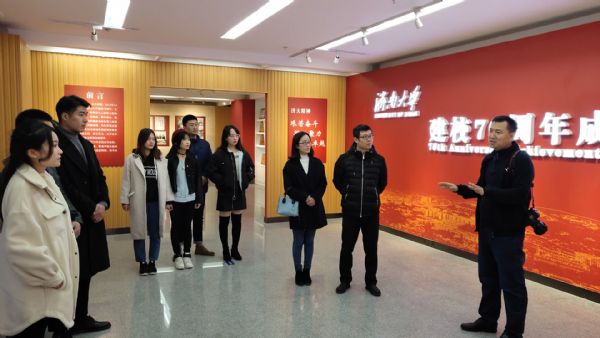 在此次观展过程中,很荣幸邀请到校宣传部副部长刘怀柱老师为我们讲解。刘老师从济大的历史沿革到如今学校在教育教学、科学研究、人才培养、国际交流合作等方面取得的成就再到建设创新性、国际化、有特色世界高水平大学的奋斗目标,为学生党员们做了详细地讲解。