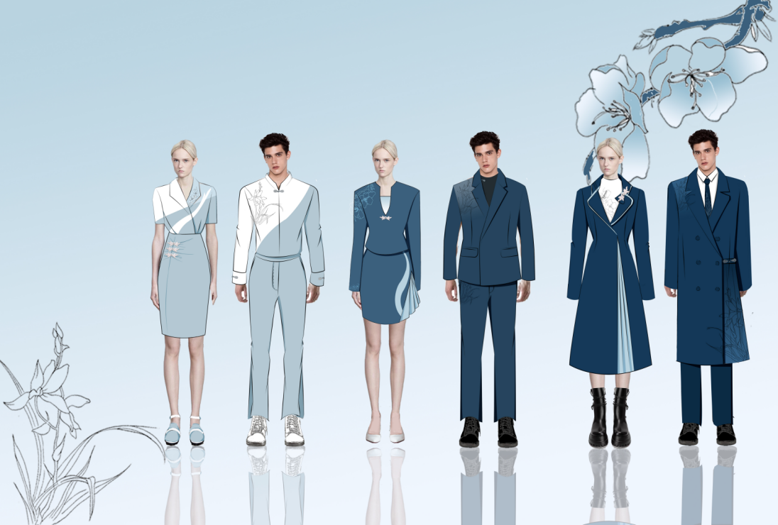 丰收昳涵同学连续两年在“山东省大学生科技节”的服装设计大赛中获得一等奖。本次大赛设计为中小学教师职业装。“桃李满天下,春晖遍四方”,歌须老师,不由让我们想到了桃花,教育事业者无私奉献的精神,像兰花这样傲岸高洁的君子一般,由此设计中以桃花和兰草为引,镶嵌在服装设计中,多处运用了盘扣设计,将民国时期的古韵与现代制服的正式相结合,正式又不显呆板,色彩以白蓝为主,严肃且不失温柔,曲线分割也使服装感受更加柔和。
