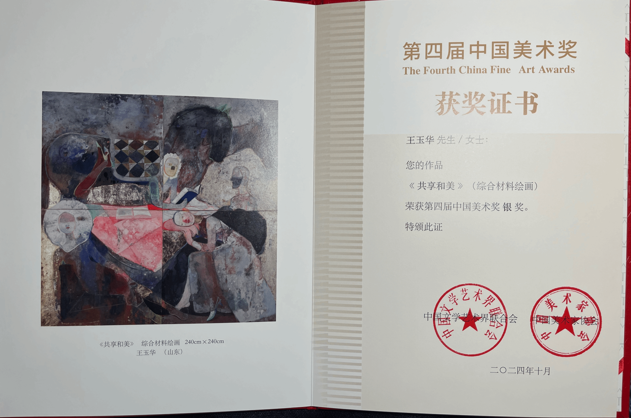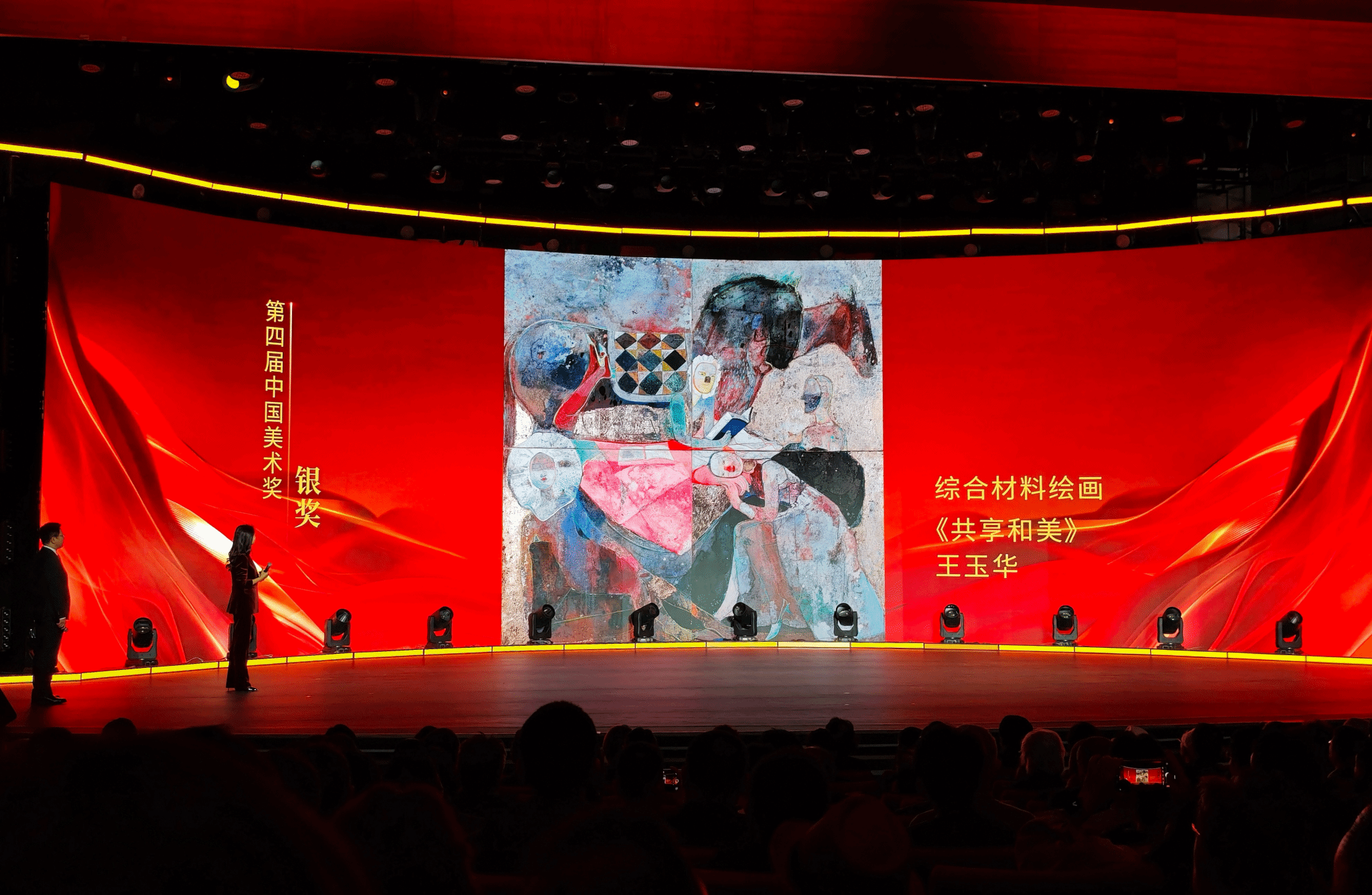 美术系综合材料绘画教研室主任王玉华副教授的综合材料绘画作品《共享和美》,荣获第四届“中国美术奖”银奖,这不仅是全国十四届美展综合材料绘画领域的最高奖项,更代表着我校美术综合材料绘画首次在“中国美术奖”评选中取得重大突破,为我校赢得了极高的荣誉与肯定。